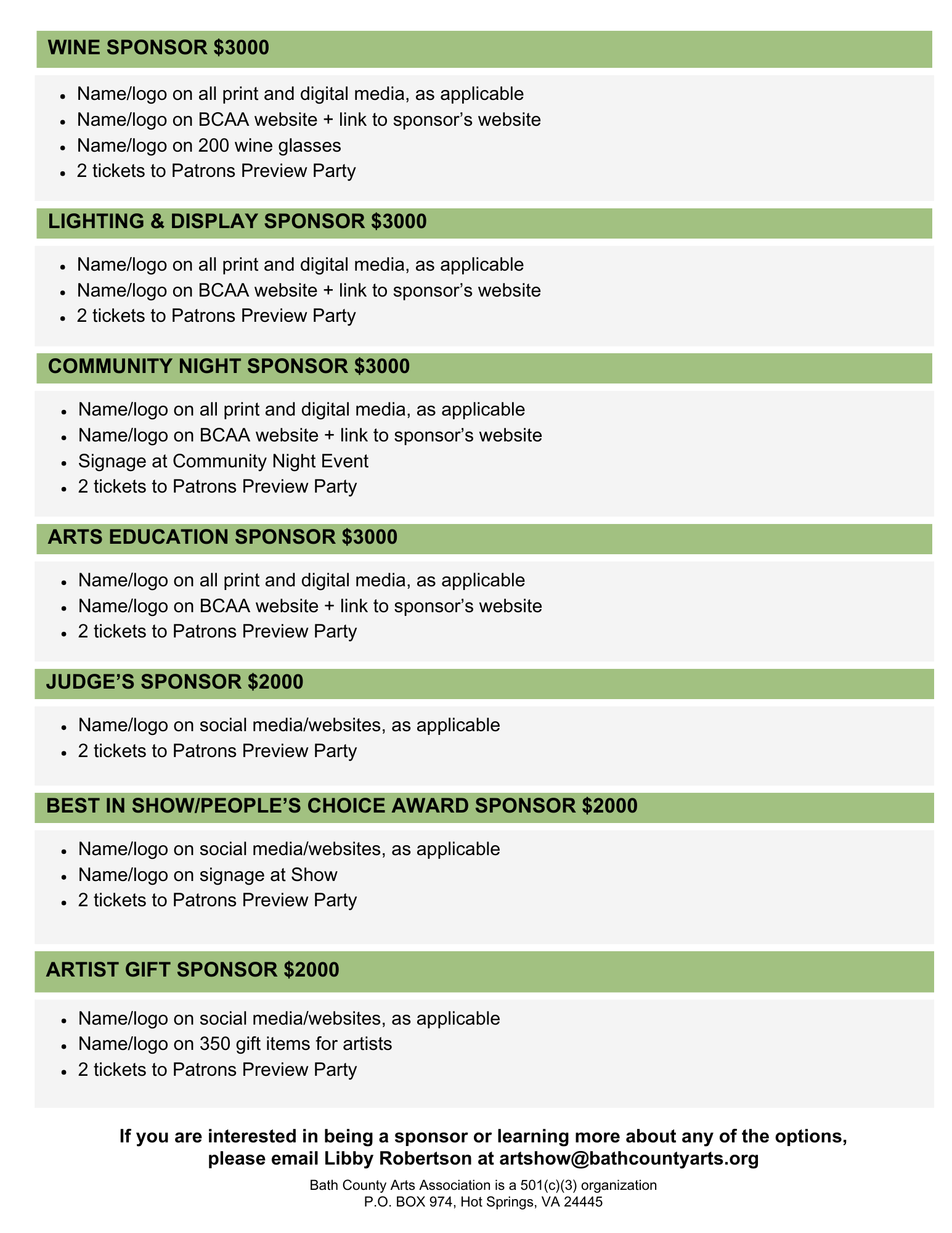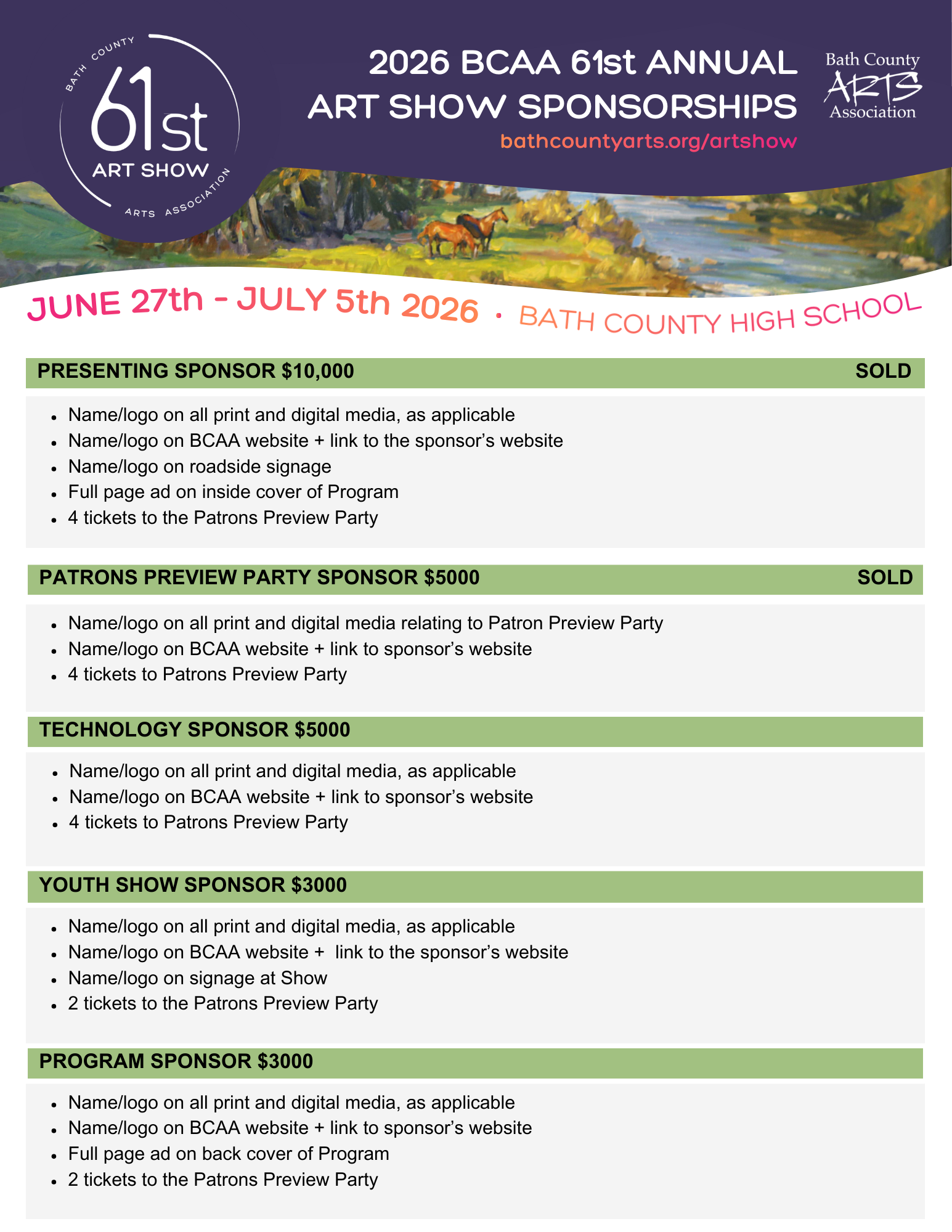 Get involved this year as an Art Show Sponsor! We offer a variety of sponsorship levels and all funds go to support the arts in Bath County. Please read more about our sponsorship opportunities below or contact us directly at info@bathcountyarts.org to design a custom sponsorship that works for you.