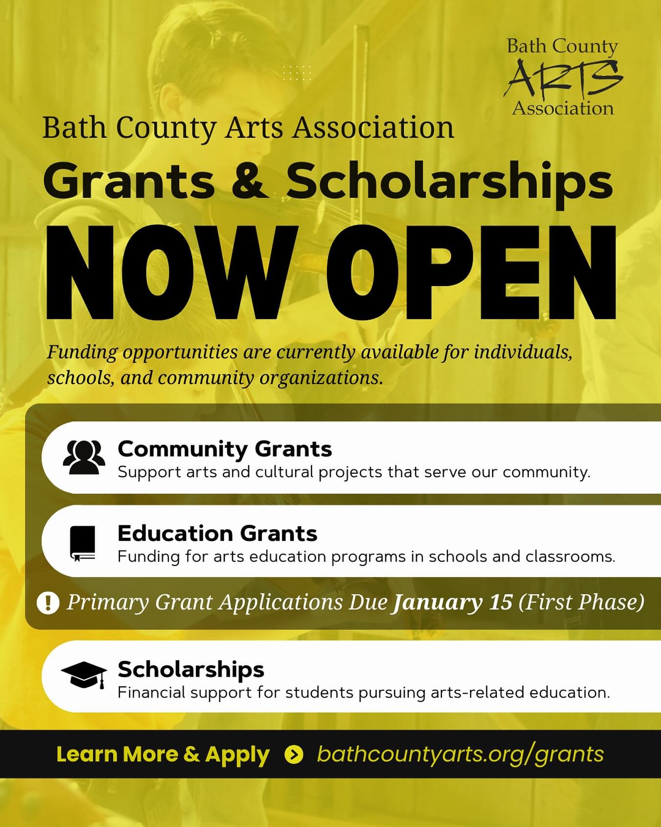 If you have further question you can email us at info@bathcountyarts.org